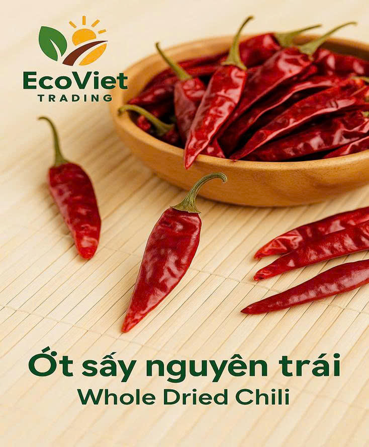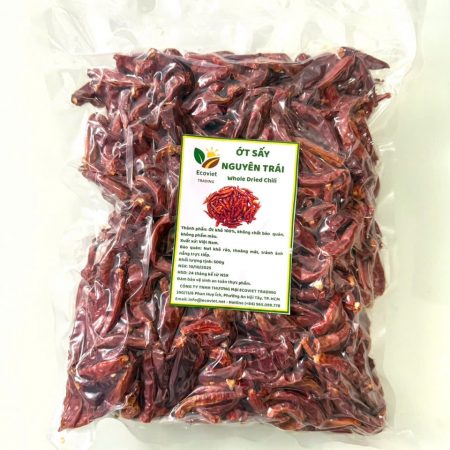 Ớt sấy nguyên trái là một trong những sản phẩm đặc trưng của EcoViet, được chọn lọc từ những trái ớt chín đỏ tươi, cay nồng tự nhiên, sau đó sấy khô bằng công nghệ hiện đại để giữ nguyên màu sắc, hương vị và giá trị dinh dưỡng. Sản phẩm Ớt sấy EcoViet không chỉ phổ biến trong ẩm thực Việt Nam mà còn được xuất khẩu đến nhiều thị trường quốc tế như Hàn Quốc, Nhật Bản, Trung Quốc và châu Âu.